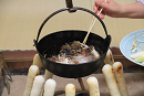 - 우엉은 되도록 얇게 조릿대 잎 모양으로 얇게 엇비슷이 자르고, 살짝 데친 토란, 파, 미나리를 사용한다.