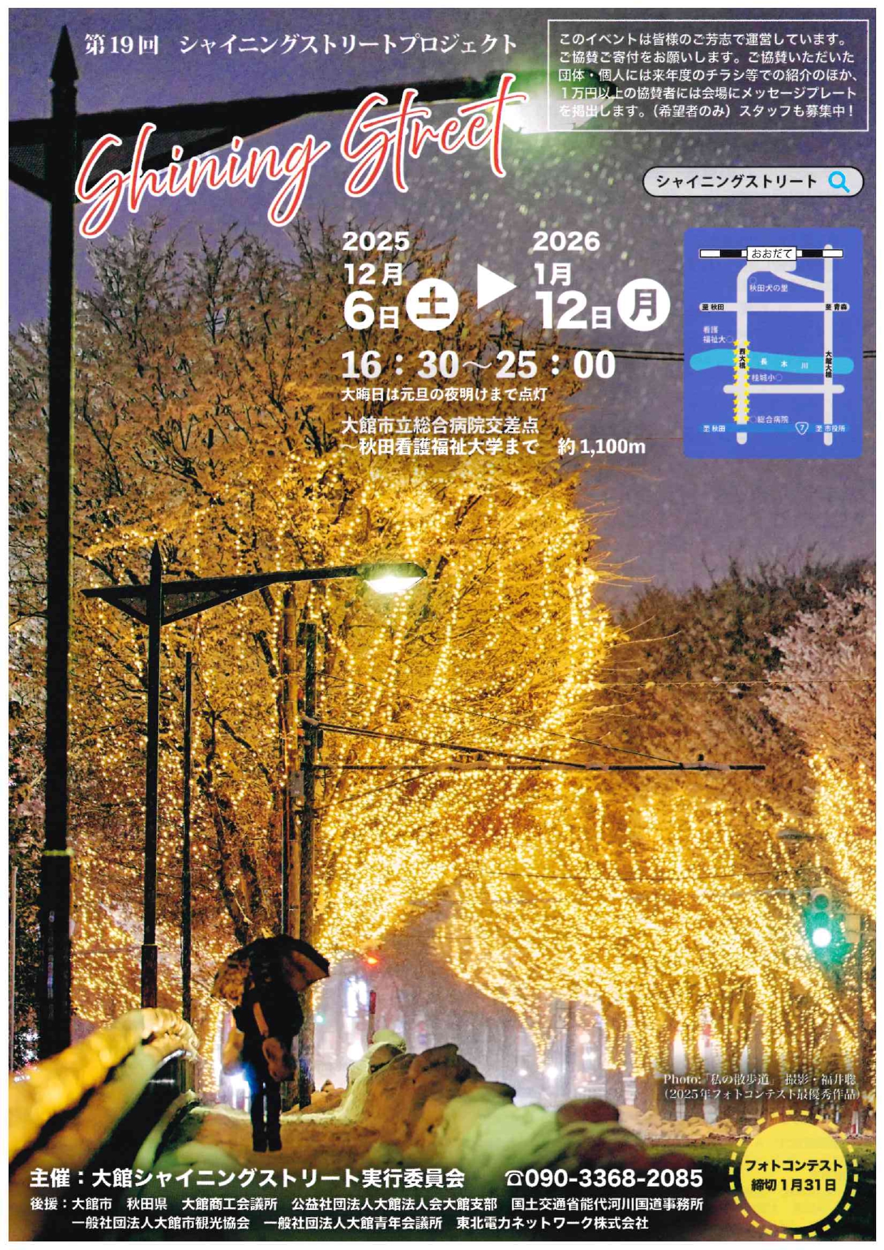 市道大館駅東大館線(通称22m道路)市立総合病院交差点から秋田看護福祉大学正門道路両側の街路樹と大館西大橋に電飾が施され、幻想的な空間を味わえます。