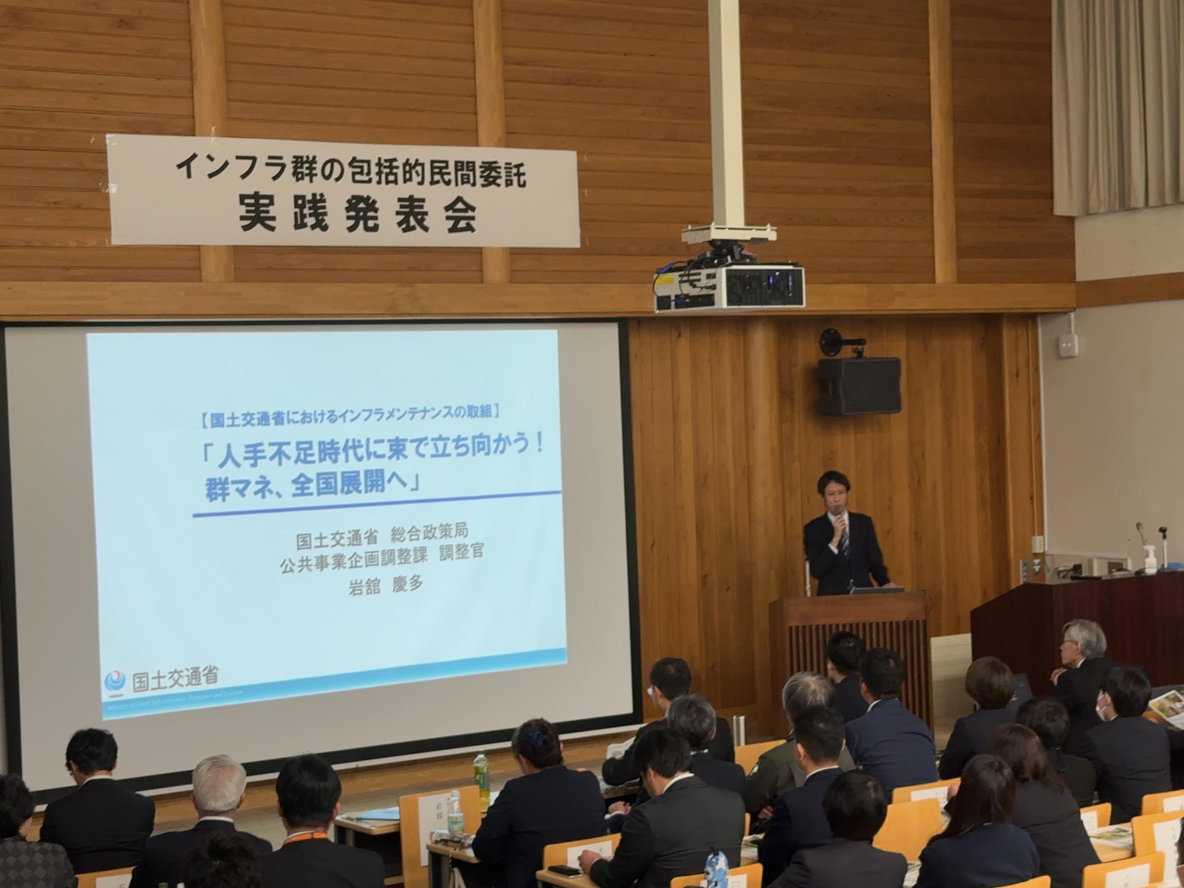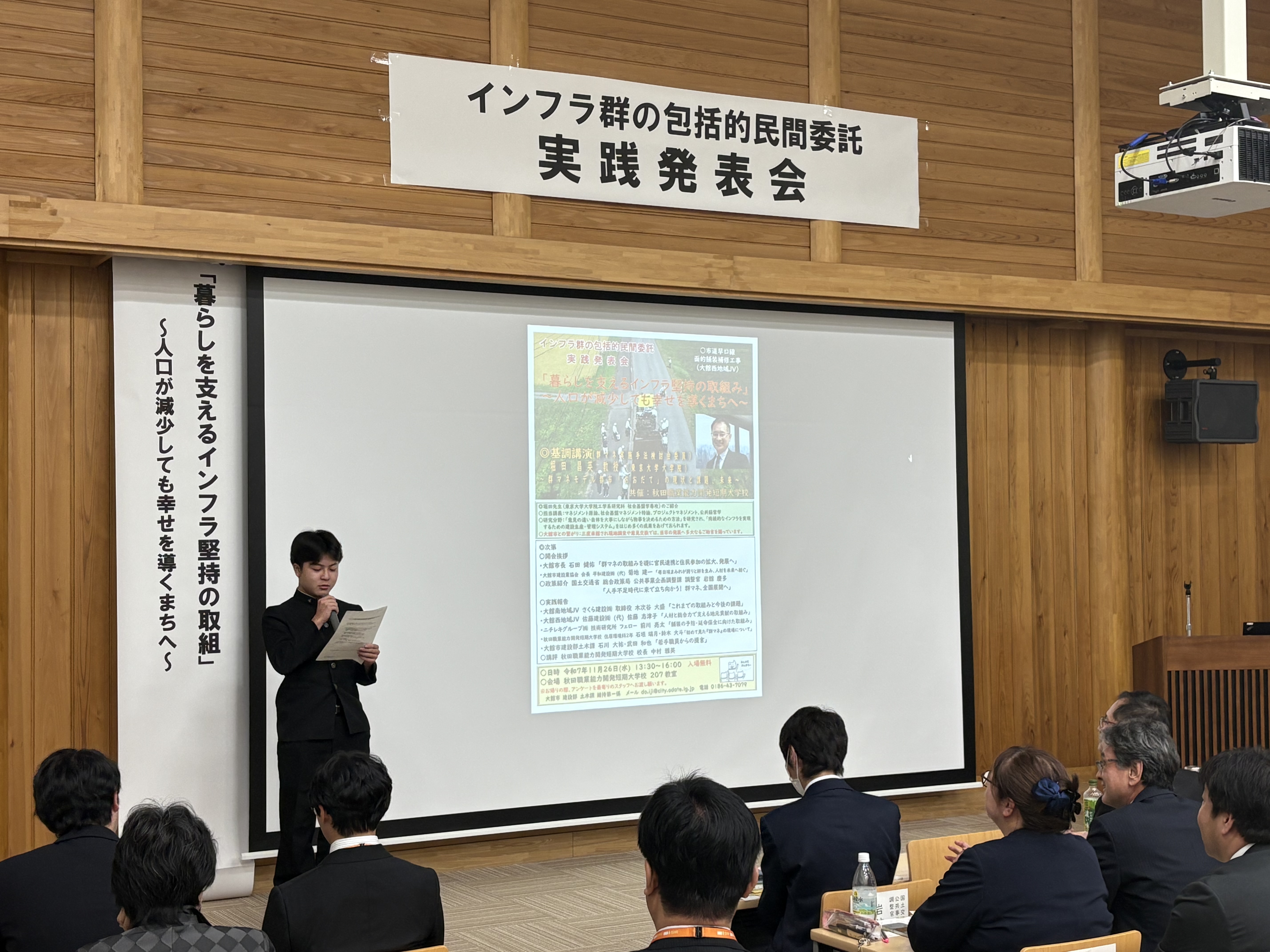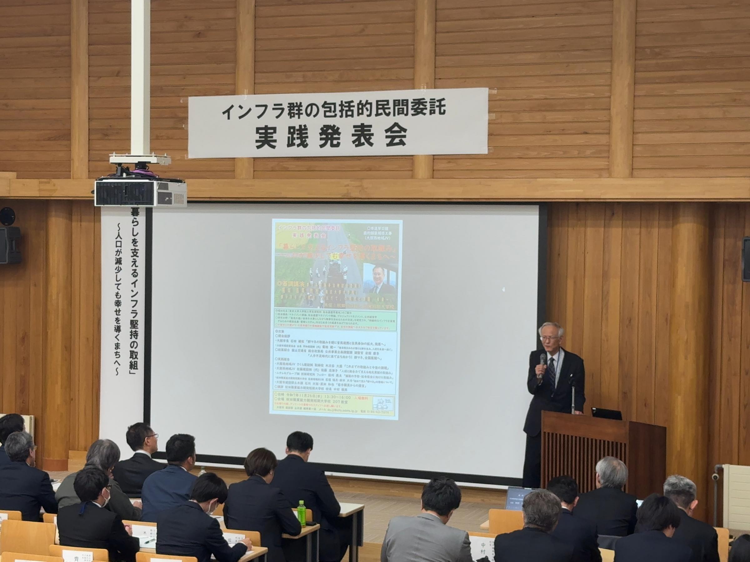 「人口減少」と「老朽インフラ増大」の社会課題を受けとめ、「人口が減少しても幸せを導くまち」を目指し、「インフラ群の包括的民間委託 実践発表会」を開催いたしました。当日は、市民や学生の皆様はじめ、140名の方々に参加いただきました。
