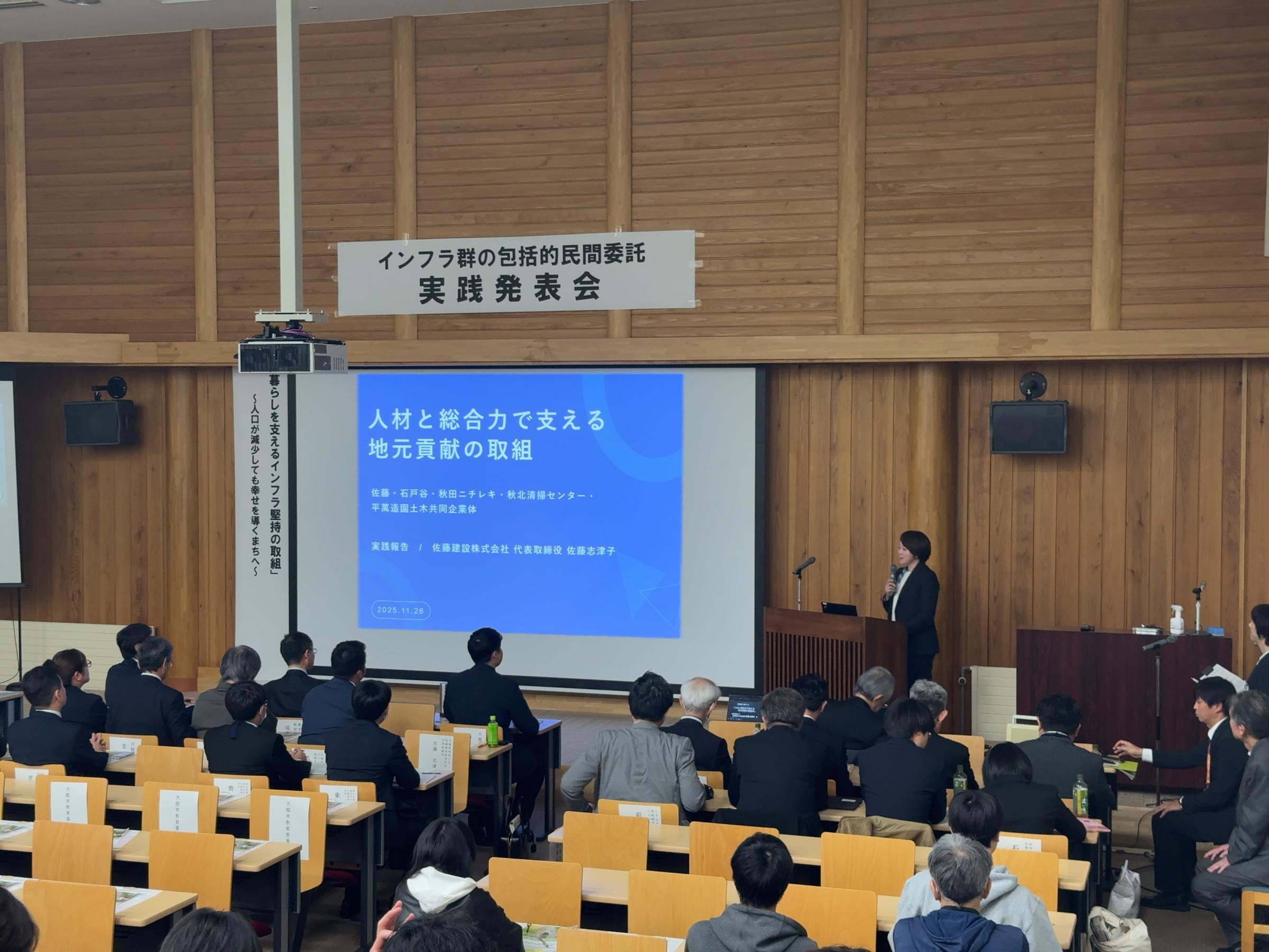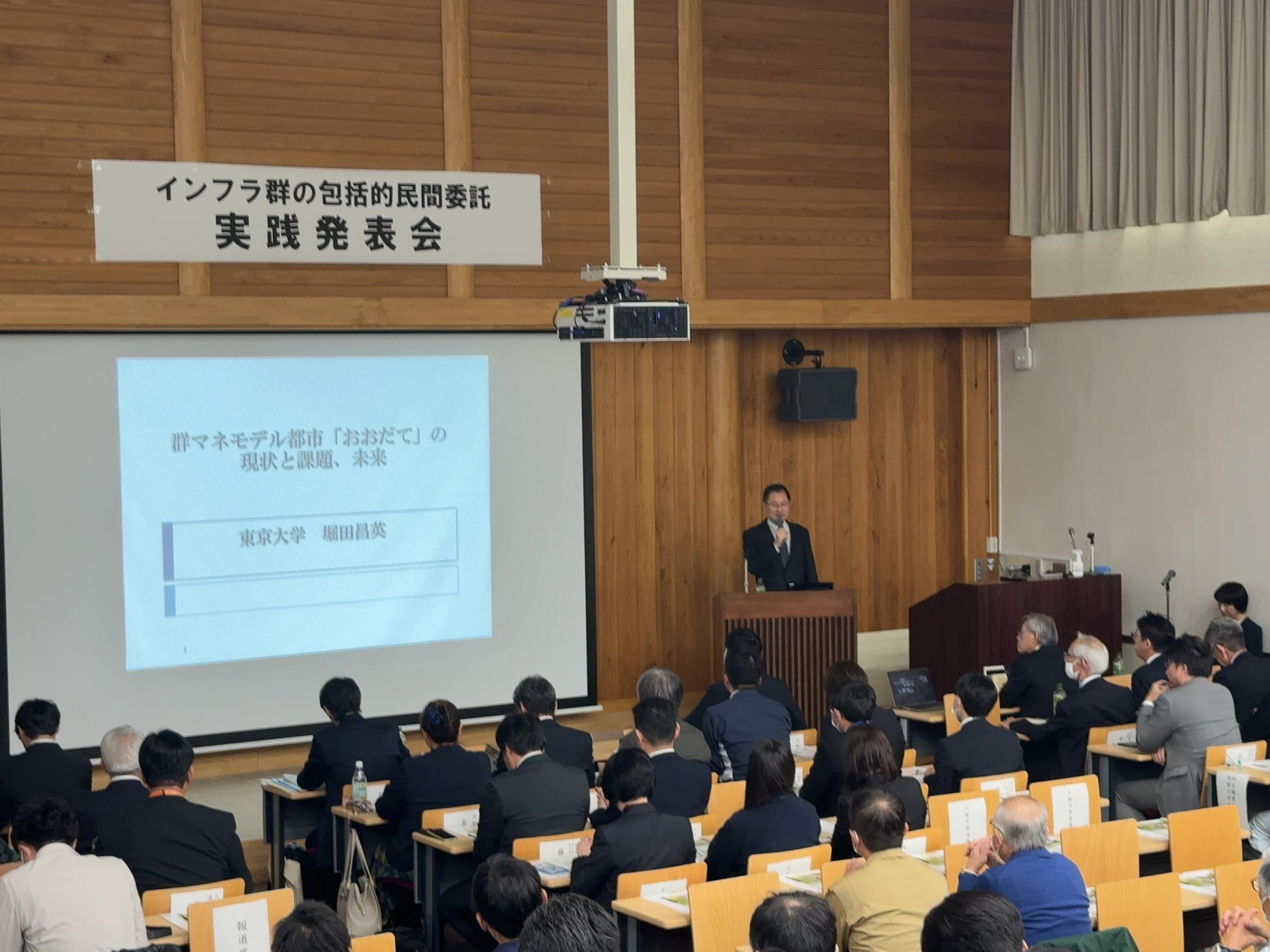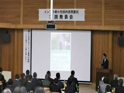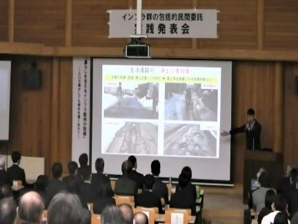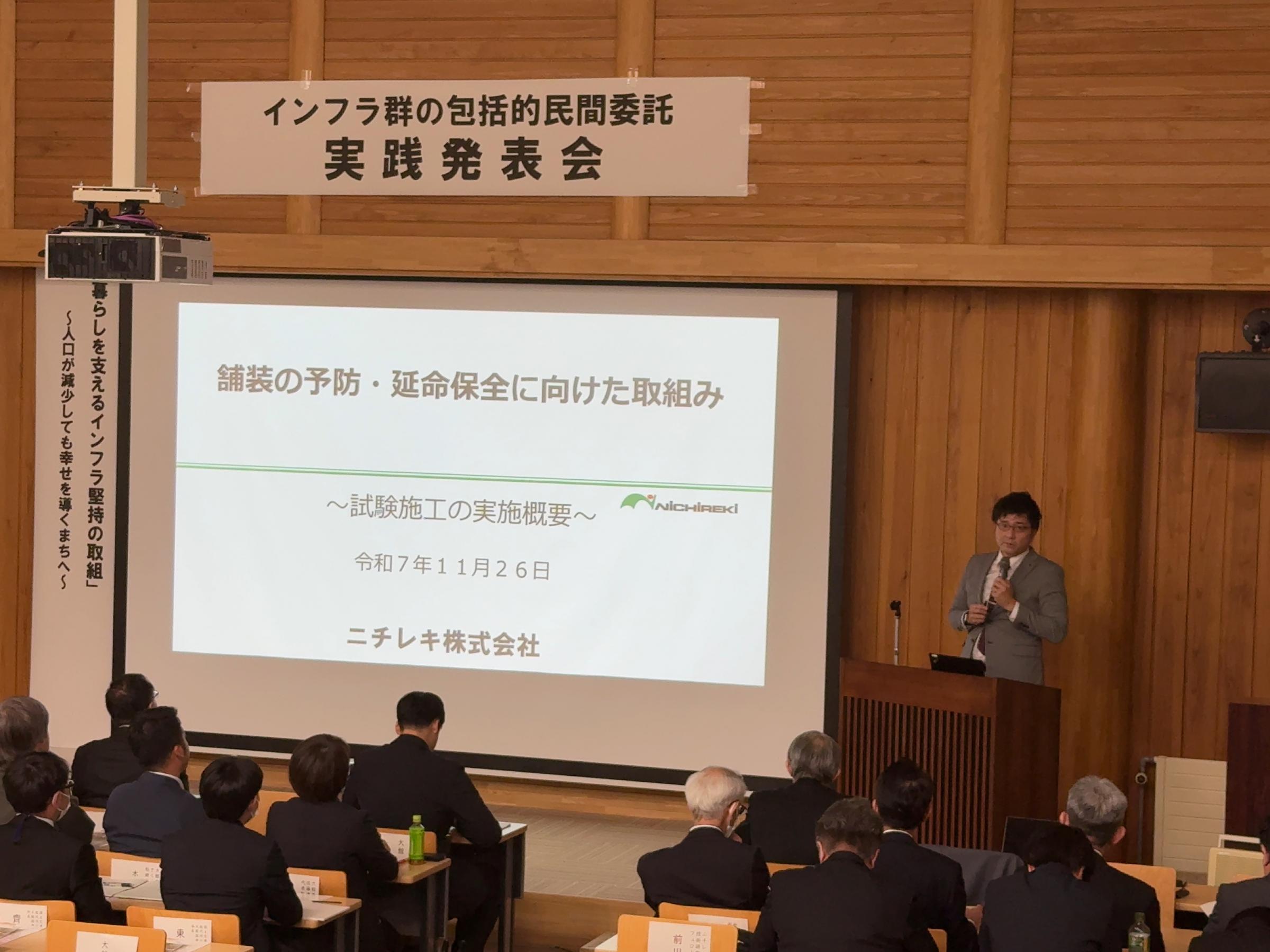 「人口減少」と「老朽インフラ増大」の社会課題を受けとめ、「人口が減少しても幸せを導くまち」を目指し、「インフラ群の包括的民間委託 実践発表会」を開催いたしました。当日は、市民や学生の皆様はじめ、140名の方々に参加いただきました。