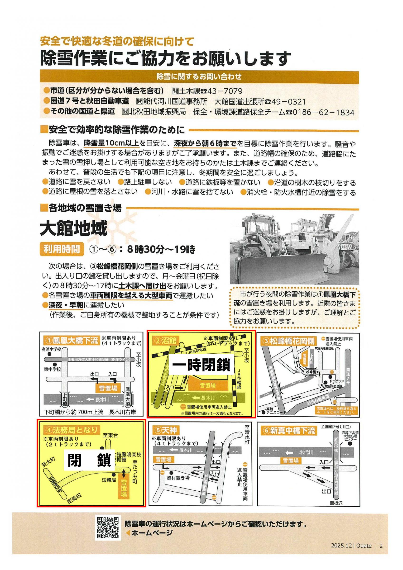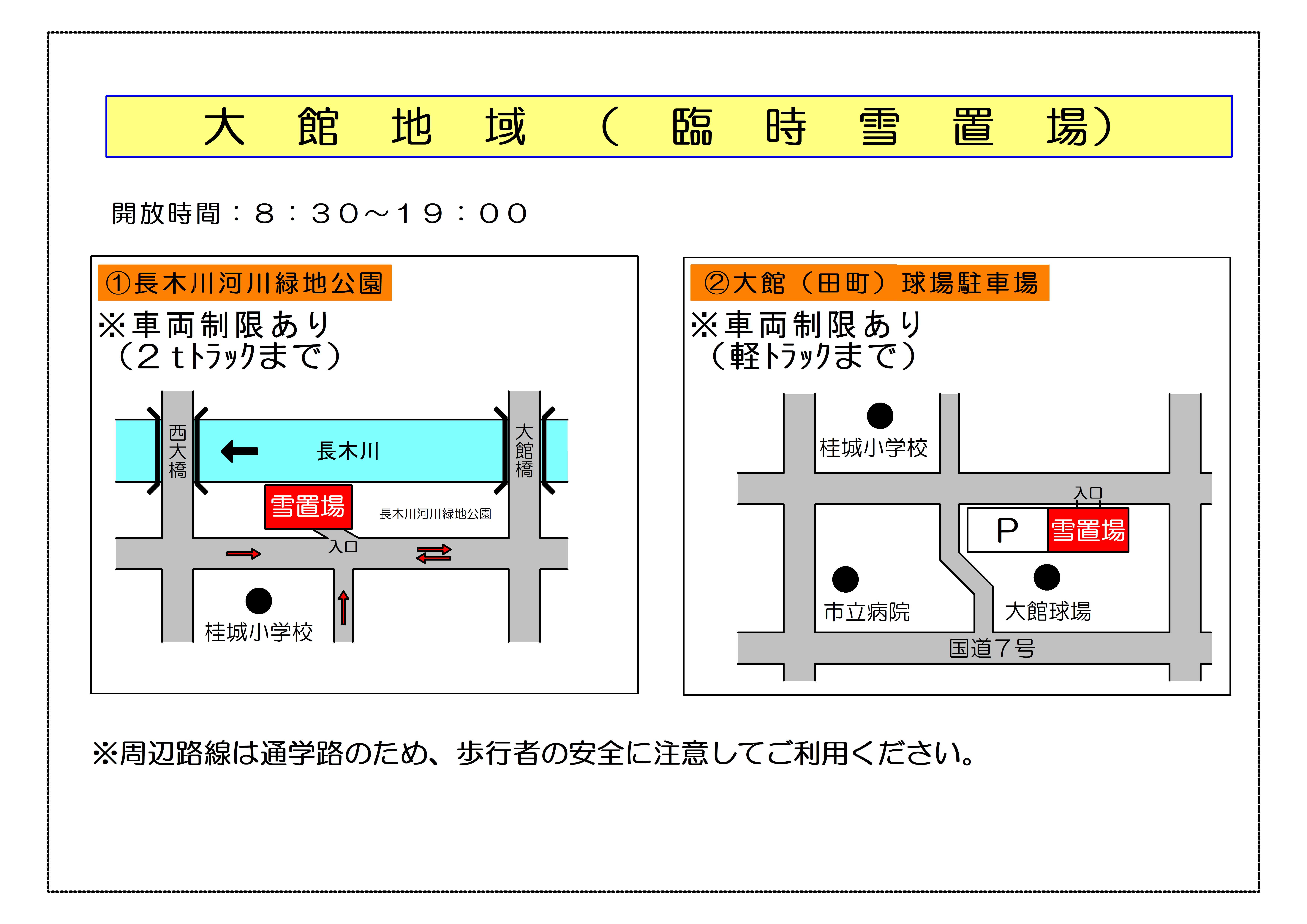 現在JavaScriptが無効になっています。 全ての機能をご利用いただくには、JavaScriptの設定を有効にしてください。 大館地域の臨時雪置き場を閉鎖します。 読み上げる 令和8年2月9日より開設致しました大館地域の臨時雪置き場を、3月1日をもって閉鎖致しました。 今後の大館地域の雪置き場については、①鳳凰大橋下流③松峰橋花岡側⑤天神⑥新真中橋下流をご利用ください。 閉鎖場所 ・長木川河川緑地公園 ・大館(田町)球場駐車場 位置図 現在大館地域で利用可能な雪置き場 位置図 大館市広報12月号を参照ください。