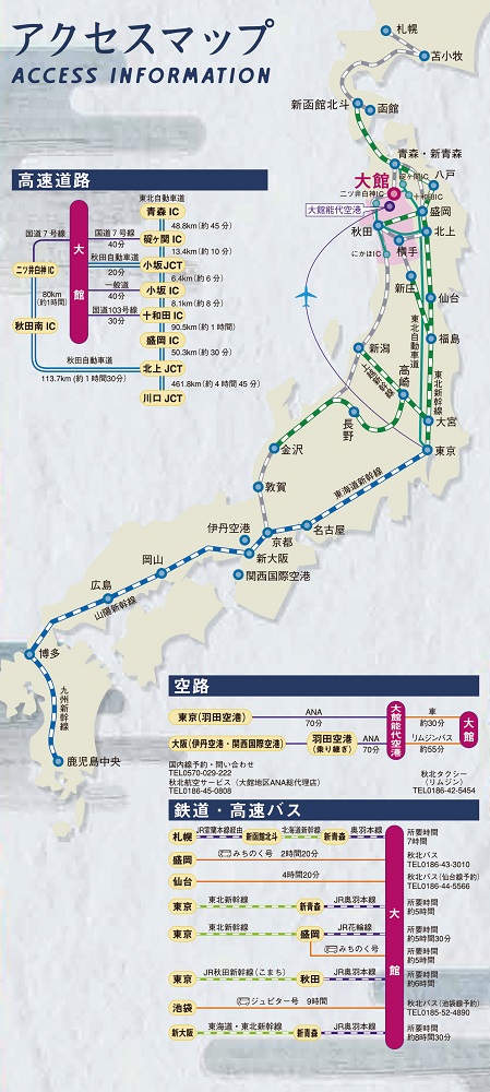 大館市周辺IC:東北自動車道ー十和田IC(鹿角市)、小坂IC(小坂町)、碇ヶ関IC(青森県平川市)