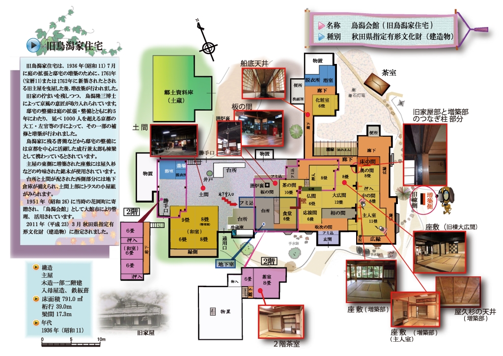 鸟泻家古宅在昭和十一年(公元1936年)时,为了要扩建庭园与房屋,将宝历年间(公元1751年-1764年)所建的旧主屋利用曳家工法(日文称将整栋建筑物原封不动地搬迁之建筑工法)移动之后,才开始进行房屋与庭园的增建。装修一边保留旧宅的原有状态,并处处导入京都的建筑风格。二楼设有茶室。从鸟泻家留下来的书信中得知,宅邸的整修是请到以京都为工作据点的成行兼太郎作为工程的统领师傅。