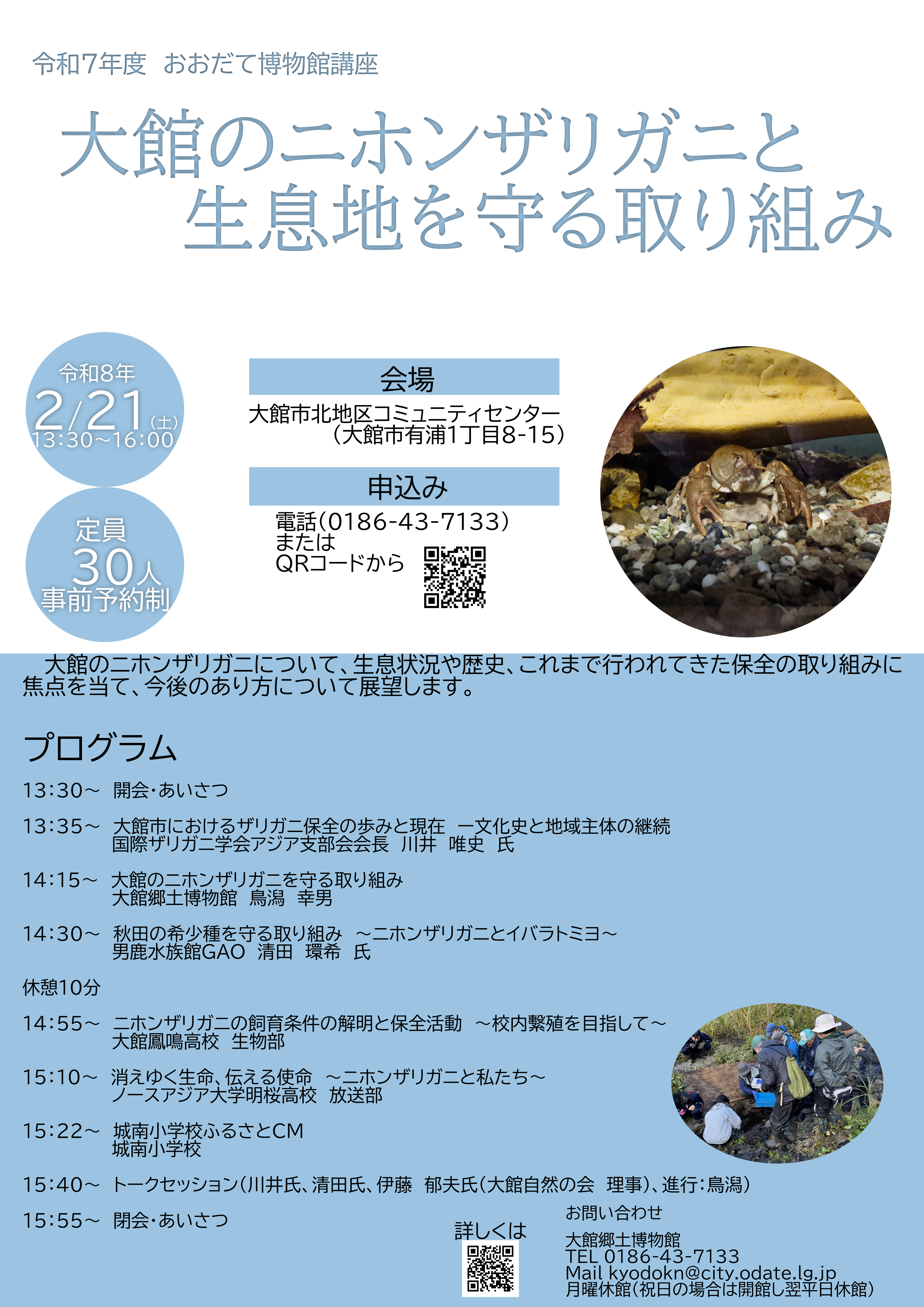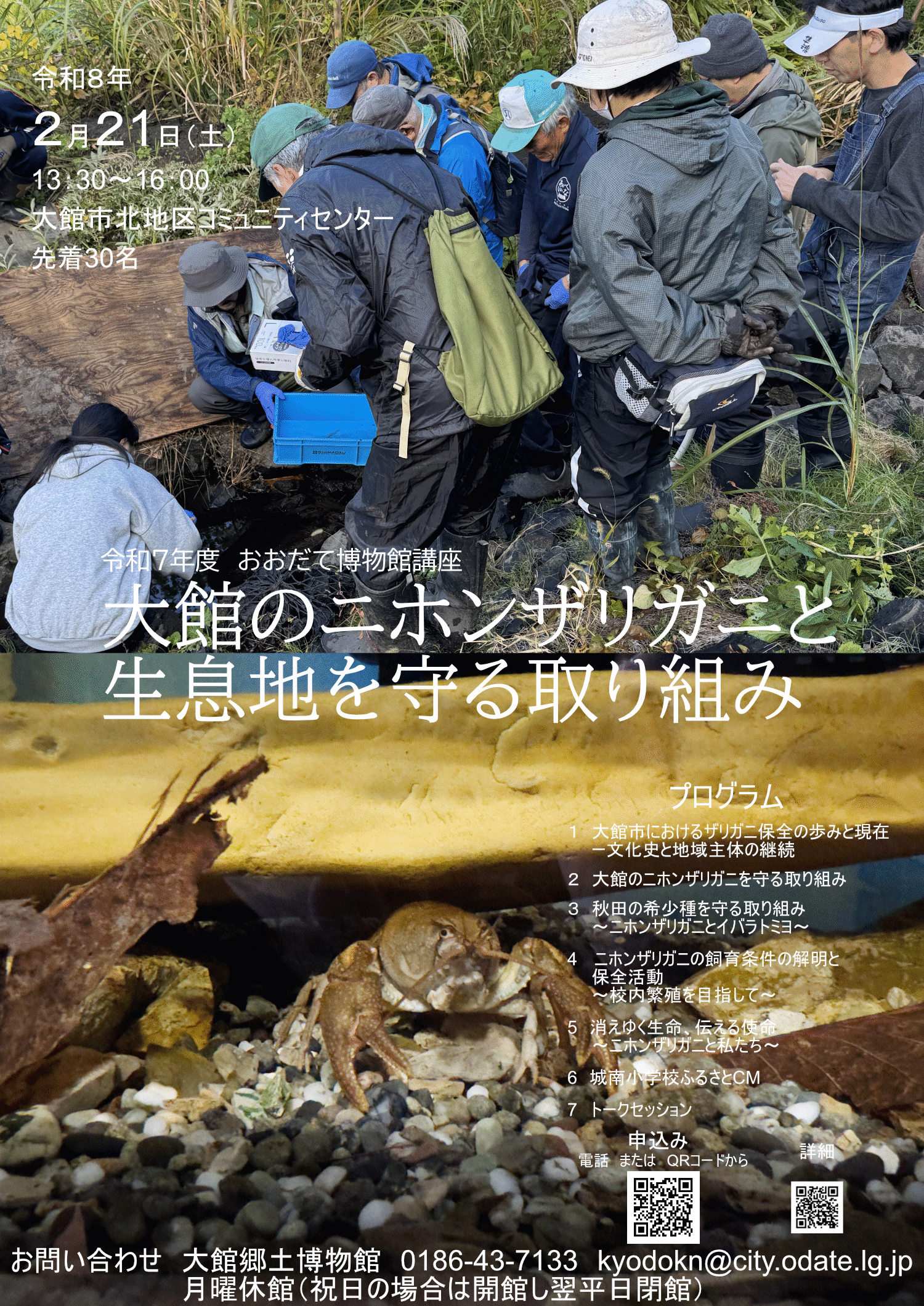 北鹿地方の自然、歴史、芸術などについて、皆さんの研究活動や生涯学習に役立てていただくことを目的に、「おおだて博物館講座」を開催します。今年度のテーマは、「大館のニホンザリガニと生息地を守る取り組み」です。聴講したい方は、事前に申し込んでください。