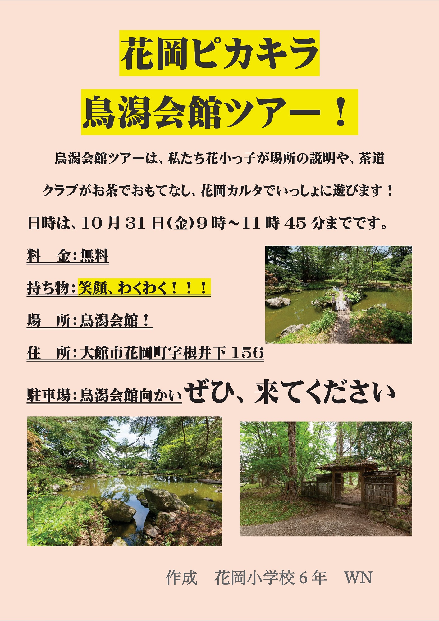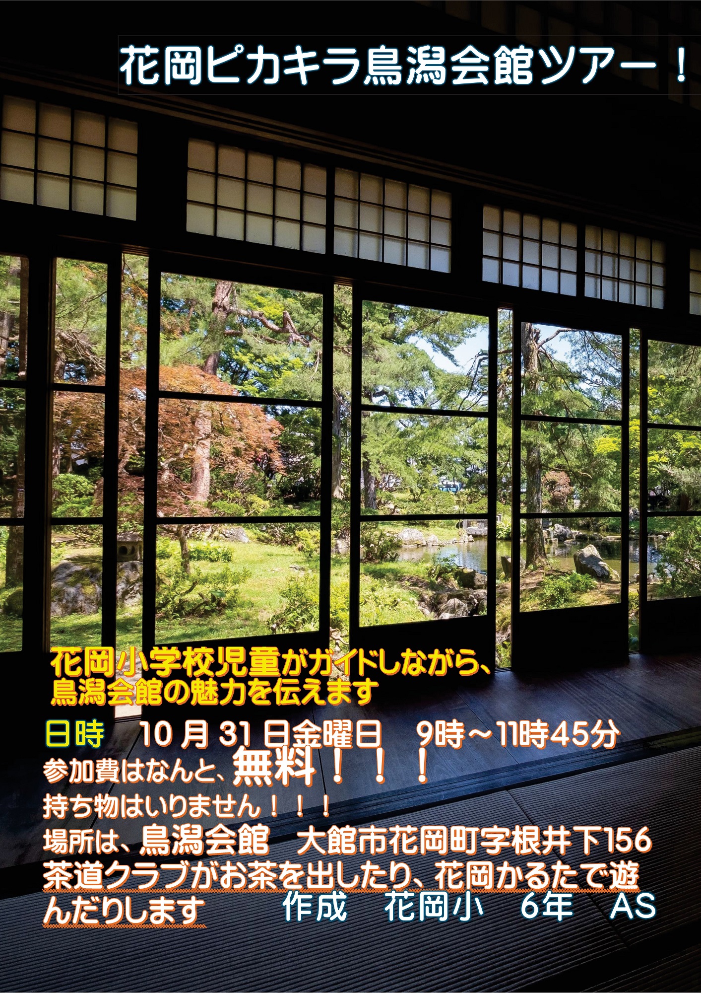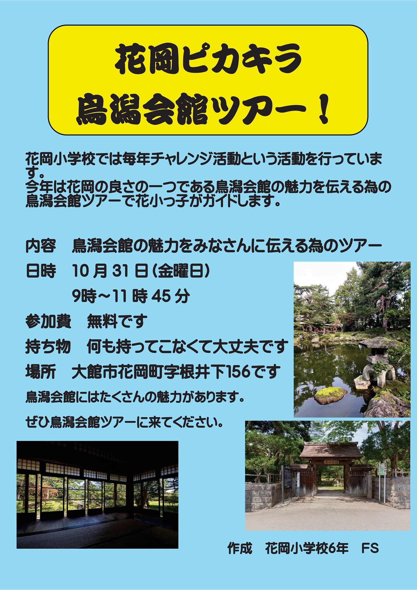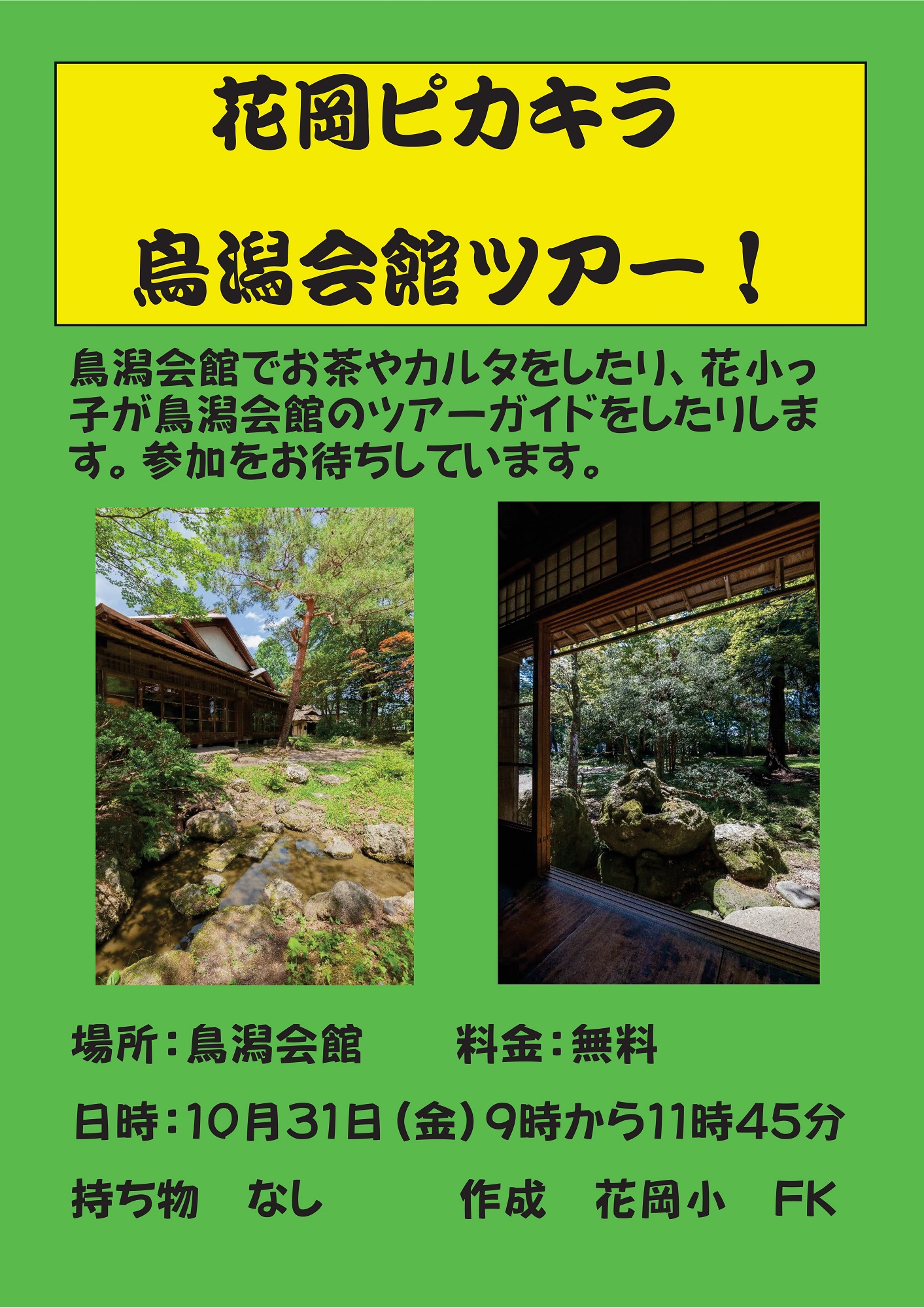 1日目の「花岡ピカキラ鳥潟会館ツアー!」は、花岡小学校児童が企画・運営するチャレンジ企画です。庭園や館内を児童がガイドし、呈茶サービス、花岡ふるさとカルタ体験を行います。PR動画も作成するなど、広報活動にも力を入れています。