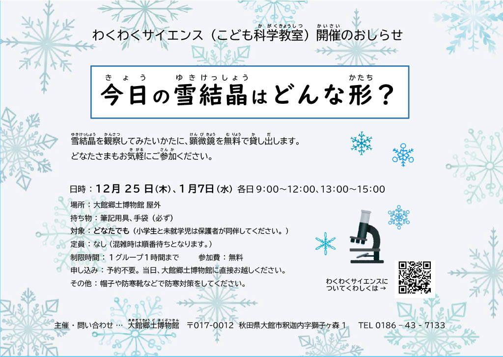 雪の結晶の観察用に、顕微鏡(けんびきょう)を無料で貸し出します。学校の冬休み新聞や、SNSへの掲載などに活用してください。雪がちらちらと舞っているときが観察しやすくおすすめです。