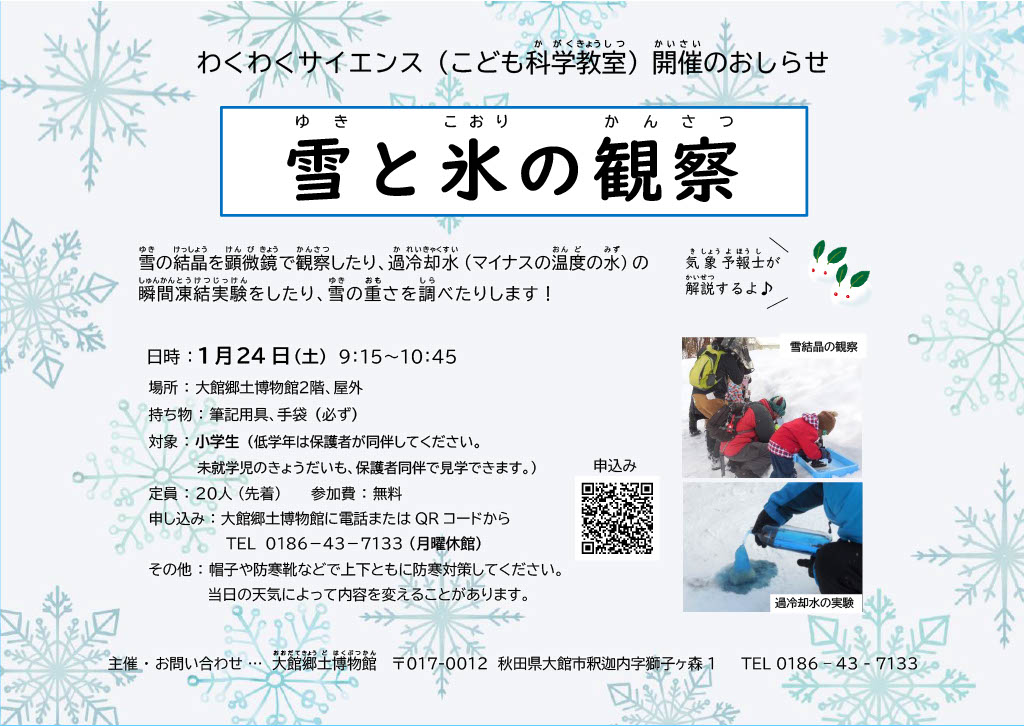 雪の結晶の観察や、水が一瞬で凍る過冷却水(かれいきゃくすい)の実験、積雪の断面観察などを通し、雪と氷の不思議を体験しましょう。気象予報士が解説します。